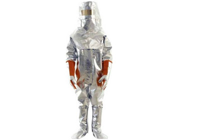 隔熱連體套裝,表面鍍鋁隔熱面料(不含石棉),頭罩帶有可更換鍍金大視野面屏,手套掌面為牛皮材質(zhì)。靴套采用魔術(shù)貼粘貼