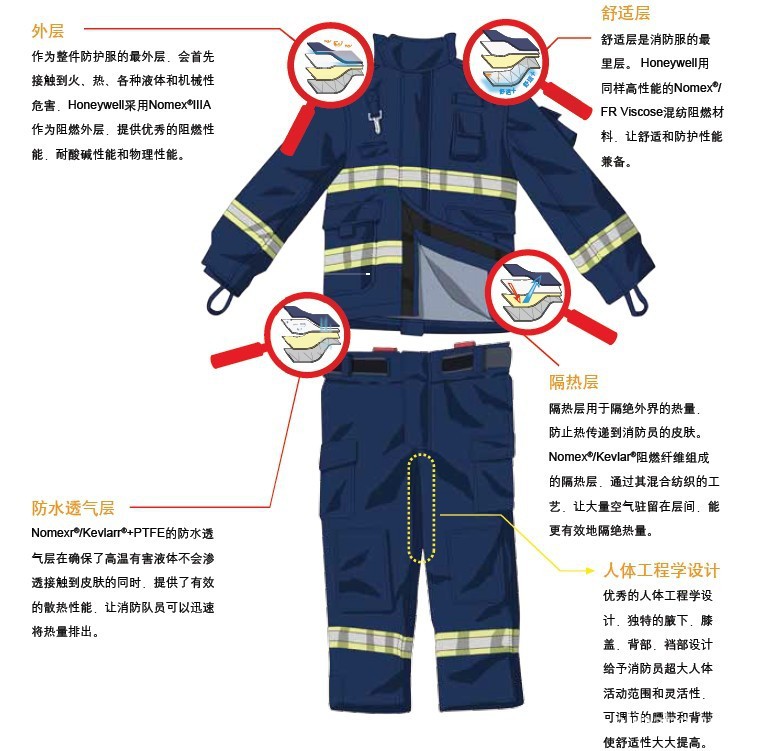 4,舒適層:舒適層是消防服的里層,HONEYWELL用同樣高性能的Nomex/FR Viscose混紡阻燃材料,讓舒適和防護(hù)性能兼?zhèn)洹?br />