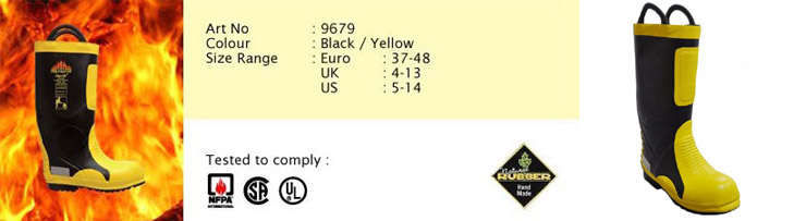 Vulcanized Rubber Upper and Sole meets NFPA 1971 Standard on Protective Ensemble for Structural Fire Fighting 2007 Edition.