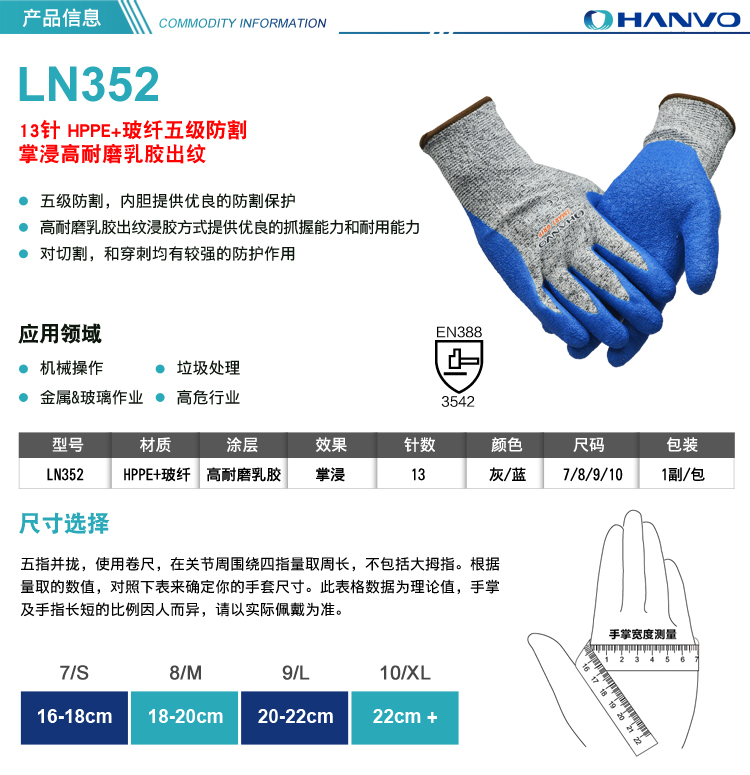 產(chǎn)品名稱:恒輝 LN352 浸膠5級防割手套