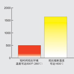 以上圖示為Fyrepel 700隔熱服針對輻射熱和環(huán)境熱防護(hù)性能的相對比較。所顯示溫度值為試驗(yàn)室數(shù)據(jù)的推測數(shù)值,并不能用于代表此防護(hù)服裝實(shí)際使用于這些溫度環(huán)境中。使用者的具體身體狀況,工作環(huán)境,以及實(shí)際工作性質(zhì)都會對防護(hù)溫度及暴露時間產(chǎn)生不確定性。